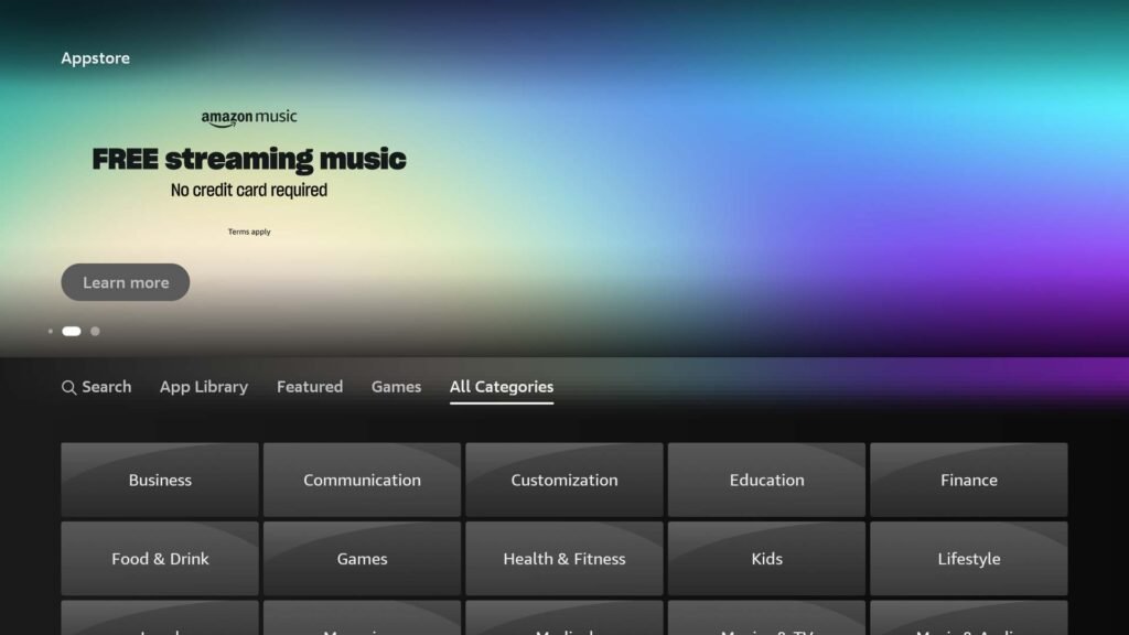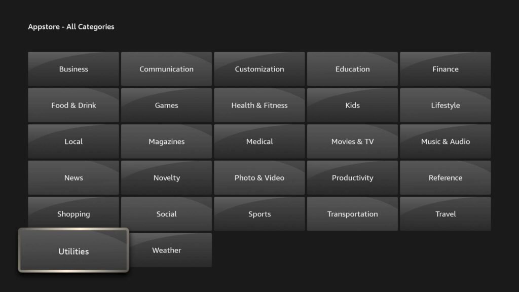 Launch the Appstore app on your Fire TV. You can locate it in your apps list or simply say “Open Appstore” or “Go to Appstore” into your remote’s microphone. Once inside, navigate to All Categories, choose Utilities, and scroll through the list to find Downloader.